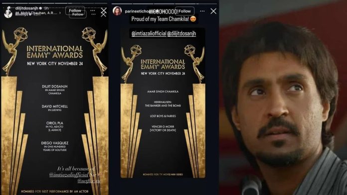 ਦਿਲਜੀਤ ਦੋਸਾਂਝ ਅਤੇ ਇਮਤਿਆਜ਼ ਅਲੀ ਨੇ ਅੰਤਰਰਾਸ਼ਟਰੀ ਐਮੀ ਅਵਾਰਡ 2025 ਲਈ ਨਾਮਜ਼ਦਗੀਆਂ ਪ੍ਰਾਪਤ ਕਰਕੇ ਦੇਸ਼ ਦਾ ਮਾਣ ਵਧਾਇਆ ਹੈ। ਦਿਲਜੀਤ ਦੋਸਾਂਝ ਨੂੰ ਨੈੱਟਫਲਿਕਸ ਦੀ ਬਾਉਗ੍ਰਾਫੀ ਬੈਸਡ ਫਿਲਮ ਅਮਰ ਸਿੰਘ ਚਮਕੀਲਾ ਵਿੱਚ ਪ੍ਰਸਿੱਧ ਪੰਜਾਬੀ ਗਾਇਕ ਚਮਕੀਲਾ ਦੀ ਭੂਮਿਕਾ ਲਈ ਸਰਵੋਤਮ ਅਦਾਕਾਰ ਲਈ ਨਾਮਜ਼ਦ ਕੀਤਾ ਗਿਆ ਹੈ। ਫਿਲਮ ਨੂੰ ਸਰਵੋਤਮ ਟੀਵੀ ਫਿਲਮ/ਮਿੰਨੀ-ਸੀਰੀਜ਼ ਸ਼੍ਰੇਣੀ ਵਿੱਚ ਵੀ ਨਾਮਜ਼ਦ ਕੀਤਾ ਗਿਆ ਹੈ। ਦਿਲਜੀਤ ਨੇ ਆਪਣੀ ਨਾਮਜ਼ਦਗੀ ਲਈ ਇਮਤਿਆਜ਼ ਅਲੀ ਨੂੰ ਸਿਹਰਾ ਦਿੱਤਾ, ਅਤੇ ਫਿਲਮ ਨਿਰਮਾਤਾ ਨੇ ਉਨ੍ਹਾਂ ਦਾ ਦਿਲੋਂ ਧੰਨਵਾਦ ਕੀਤਾ ਹੈ।