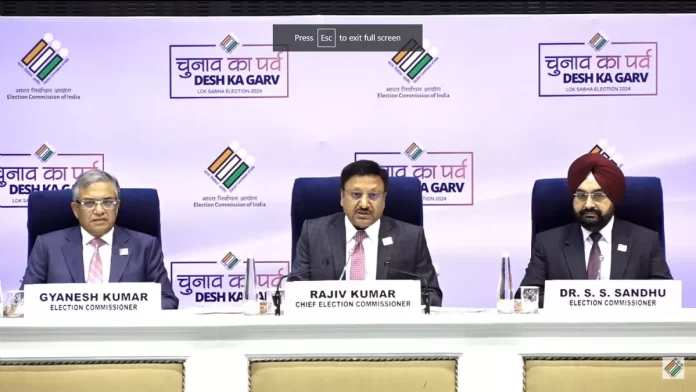 ਕੇਂਦਰੀ ਚੋਣ ਕਮਿਸ਼ਨ (EC) ਨੇ ਲੋਕ ਸਭਾ ਚੋਣਾਂ 2024 ਲਈ ਵੋਟਿੰਗ ਦੀਆਂ ਤਰੀਕਾਂ ਦਾ ਐਲਾਨ ਕਰ ਦਿੱਤਾ। ਨਿਰਪੱਖ ਅਤੇ ਸ਼ਾਂਤੀਪੂਰਵਕ ਚੋਣਾਂ ਕਰਵਾਉਣ ਲਈ ਠੋਸ ਪ੍ਰਬੰਧ ਕੀਤੇ ਗਏ ਹਨ। ਦਿੱਲੀ ਦੇ ਵਿਗਿਆਨ ਭਵਨ ਵਿੱਚ ਕੇਂਦਰੀ ਚੋਣ ਕਮਿਸ਼ਨ ਦੀ ਪ੍ਰੈਸ ਕਾਨਫਰੰਸ ਵਿੱਚ ਇਸ ਐਲਾਨ ਦੇ ਨਾਲ ਹੀ ਦੇਸ਼ ਵਿੱਚ ਆਦਰਸ਼ ਚੋਣ ਜ਼ਾਬਤਾ ਲਾਗੂ ਹੋ ਗਿਆ ਹੈ।
