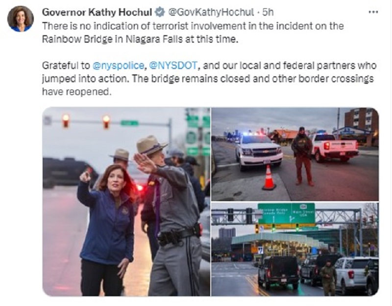 ਕੁਝ ਘੰਟਿਆਂ ਬਾਅਦ ਨਿਊਯਾਰਕ ਦੀ ਗਵਰਨਰ ਕੈਥੀ ਹੋਚੁਲ ਅਤੇ ਪੱਛਮੀ ਨਿਊਯਾਰਕ ਲਈ ਅਮਰੀਕੀ ਅਟਾਰਨੀ ਟ੍ਰਿਨੀ ਰੌਸ ਨੇ ਲੋਕਾਂ ਵਿਚਲੇ ਡਰ ਨੂੰ ਸ਼ਾਂਤ ਕਰਨ ਦੀ ਕੋਸ਼ਿਸ਼ ਕੀਤੀ ਅਤੇ ਕਿਹਾ ਕਿ ਜਾਂਚ ਅਜੇ ਸ਼ੁਰੂਆਤੀ ਪੜਾਅ ਵਿਚ ਹੈ। ਹੋਚੁਲ ਨੇ ਕਿਹਾ, ”ਇਸ ਸਮੇਂ ਮਿਲੀ ਜਾਣਕਾਰੀ ਦੇ ਆਧਾਰ ‘ਤੇ ਘਟਨਾ ‘ਚ ਅੱਤਵਾਦੀ ਗਤੀਵਿਧੀ ਦਾ ਕੋਈ ਸੰਕੇਤ ਨਹੀਂ ਹੈ।” ਨਿਊਯਾਰਕ ਦੇ ਬਫੇਲੋ ‘ਚ ਰੌਸ ਨਾਲ ਇਕ ਹੋਰ ਨਿਊਜ਼ ਕਾਨਫਰੰਸ ‘ਚ ਏਰੀ ਕਾਊਂਟੀ ਸ਼ੈਰਿਫ ਜੌਨ ਗਾਰਸੀਆ ਨੇ ਕਿਹਾ,”ਅਸੀਂ ਜਾਂਚ ਕਰ ਰਹੇ ਹਾਂ।” ਘਟਨਾ ਦੇ ਸਬੰਧ ਵਿੱਚ ਅਮਰੀਕੀ ਸਰਕਾਰ ਦੁਆਰਾ ਜਾਰੀ ਕੀਤੀ ਗਈ ਫੁਟੇਜ ਵਿੱਚ ਦਿਖਾਇਆ ਗਿਆ ਹੈ ਕਿ ਕਾਰ ਮੁੱਖ ਵਾਹਨ ਚੌਕੀ ਦੇ ਬਿਲਕੁਲ ਪੂਰਬ ਵਿੱਚ ਯੂ.ਐੱਸ ਕਸਟਮ ਅਤੇ ਬਾਰਡਰ ਪ੍ਰੋਟੈਕਸ਼ਨ ਖੇਤਰ ਵਿੱਚ ਇੱਕ ਗਿੱਲੀ ਸੜਕ, ਮੱਧ-ਹਵਾ ਦੇ ਇੱਕ ਚੌਰਾਹੇ ਤੋਂ ਲੰਘਦੀ ਹੈ।