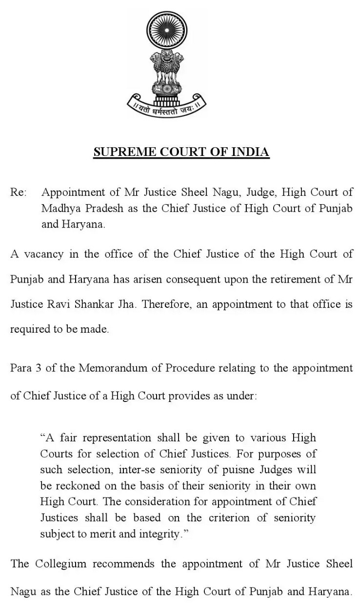 ਸੁਪਰੀਮ ਕੋਰਟ ਕੌਲੇਜੀਅਮ ਨੇ ਮੱਧ ਪ੍ਰਦੇਸ਼ (ਐਮਪੀ) ਹਾਈ ਕੋਰਟ ਦੇ ਸੀਨੀਅਰ ਜੱਜ ਸ਼ੀਲ ਨਾਗੂ ਨੂੰ ਪੰਜਾਬ ਅਤੇ ਹਰਿਆਣਾ ਹਾਈ ਕੋਰਟ ਦੇ ਚੀਫ਼ ਜਸਟਿਸ ਵਜੋਂ ਨਿਯੁਕਤ ਕਰਨ ਲਈ ਆਪਣੀ ਸਹਿਮਤੀ ਦੇ ਦਿੱਤੀ ਹੈ। ਹੁਣ ਉਨ੍ਹਾਂ ਦੀ ਨਿਯੁਕਤੀ ਦੀ ਸਿਫਾਰਿਸ਼ ਰਾਸ਼ਟਰਪਤੀ ਨੂੰ ਭੇਜ ਦਿੱਤੀ ਗਈ ਹੈ। ਪੰਜਾਬ ਅਤੇ ਹਰਿਆਣਾ ਹਾਈ ਕੋਰਟ ਦੇ ਚੀਫ਼ ਜਸਟਿਸ ਦਾ ਅਹੁਦਾ ਖਾਲੀ ਹੈ। ਚੀਫ਼ ਜਸਟਿਸ ਰਵੀਸ਼ੰਕਰ ਝਾਅ ਦੇ ਸੇਵਾਮੁਕਤ ਹੋਣ ਤੋਂ ਬਾਅਦ ਹਾਈਕੋਰਟ ਦੇ ਸੀਨੀਅਰ ਜੱਜ ਜਸਟਿਸ ਰਿਤੂ ਬਾਹਰੀ ਇਸ ਵੇਲੇ ਹਾਈ ਕੋਰਟ ਦੇ ਕਾਰਜਕਾਰੀ ਚੀਫ਼ ਜਸਟਿਸ ਦਾ ਚਾਰਜ ਸੰਭਾਲ ਰਹੇ ਹਨ।