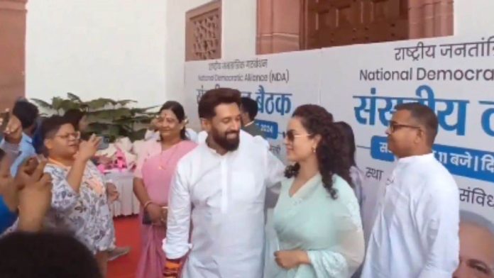 ਦਿੱਲੀ ਦੇ ਸੈਂਟਰਲ ਹਾਲ ਵਿਚ ਅੱਜ ਐੱਨਡੀਏ ਦੀ ਮੀਟਿੰਗ ਬੁਲਾਈ ਗਈ ਹੈ, ਜਿਸ ਵਿੱਚ ਸਾਰੀਆਂ ਪਾਰਟੀਆਂ ਦੇ ਪ੍ਰਮੁੱਖ ਨੇਤਾ, ਮੁੱਖ ਮੰਤਰੀ, ਸੰਸਦ ਮੈਂਬਰਾਂ ਨੇ ਸ਼ਿਰਕਤ ਕੀਤੀ। ਮੀਟਿੰਗ ਤੋਂ ਪਹਿਲਾਂ ਏਜੇਪੀ ਪ੍ਰਧਾਨ ਚਿਰਾਗ ਪਾਸਵਾਨ ਅਤੇ ਭਾਜਪਾ ਦੀ ਨਵੀਂ ਚੁਣੀ ਸੰਸਦ ਮੈਂਬਰ ਕੰਗਨਾ ਰਣੌਤ ਨੇ ਸੰਸਦ ਕੰਪਲੈਕਸ ਵਿਚ ਮੁਲਾਕਾਤ ਕੀਤੀ। ਦੋਹਾਂ ਨੇਤਾ ਇਕ-ਦੂਜੇ ਨੂੰ ਗਲੇ ਮਿਲੇ ਤੇ ਉਨ੍ਹਾਂ ਵਿਚਕਾਰ ਸੰਖੇਪ ਗੱਲਬਾਤ ਹੋਈ।